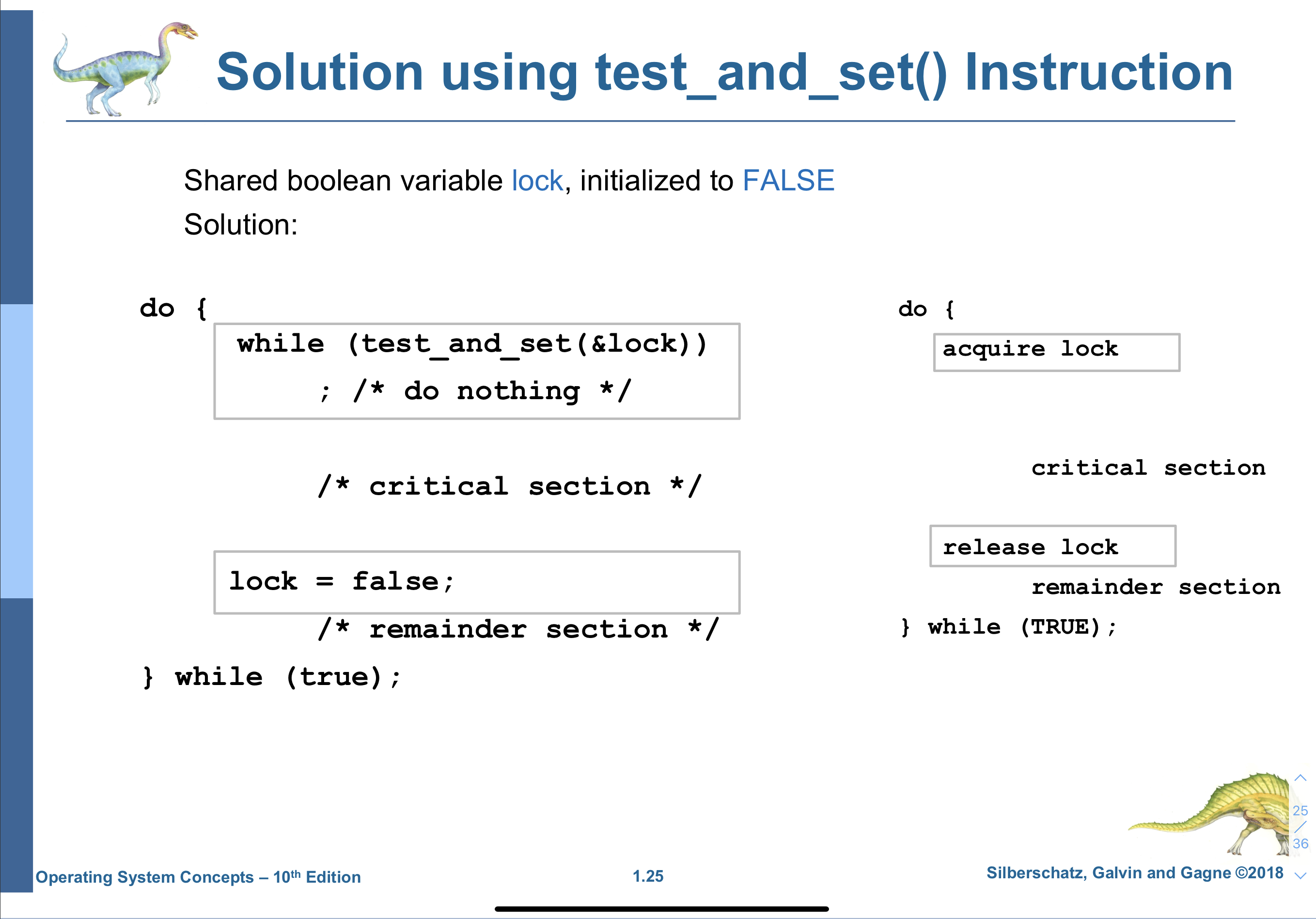 test_and_set : lock이라는 공유 변수가 한 프로세스에서 false 일 경우 lock을 trye로 만들고 critical section을 실행한다.
