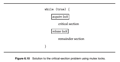 단점은 busy waiting이라는 것이다. 프로세스가 임계 구역에 있는 동안 다른 프로세스 들은 임계구역에 들어가기를 원할 때 acquire 함수를 호출하는 반복문을 계속 수행해야 한다.