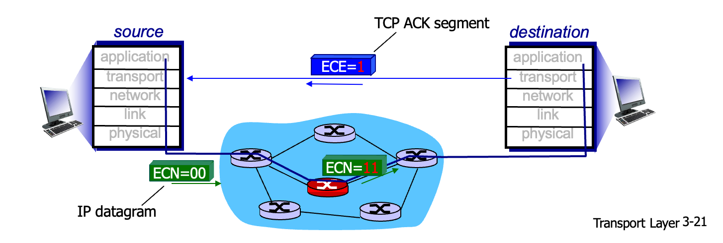 Network-assisted 방식: SNA, DECbit, TCP/IP ECN, ATM, IP에서 라우터의 지연 상태를 TCP에 알려줌, 수신 측은 송신 측에 ECN flag 세팅해서 혼잡 상태 알려줌, ECN 3개의 flag
