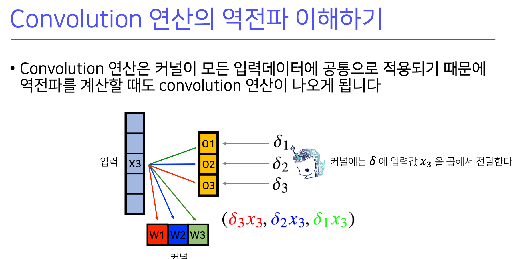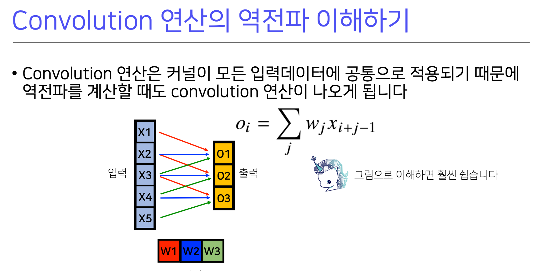 따라서 각 커널에 들어오는 모든 그레디언트를 더하면 convolution과 같아진다.