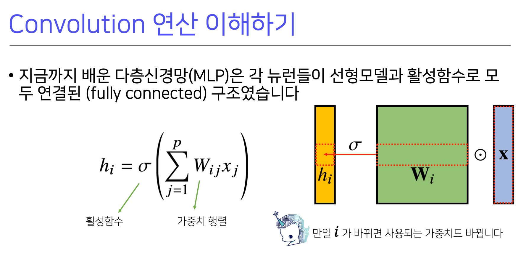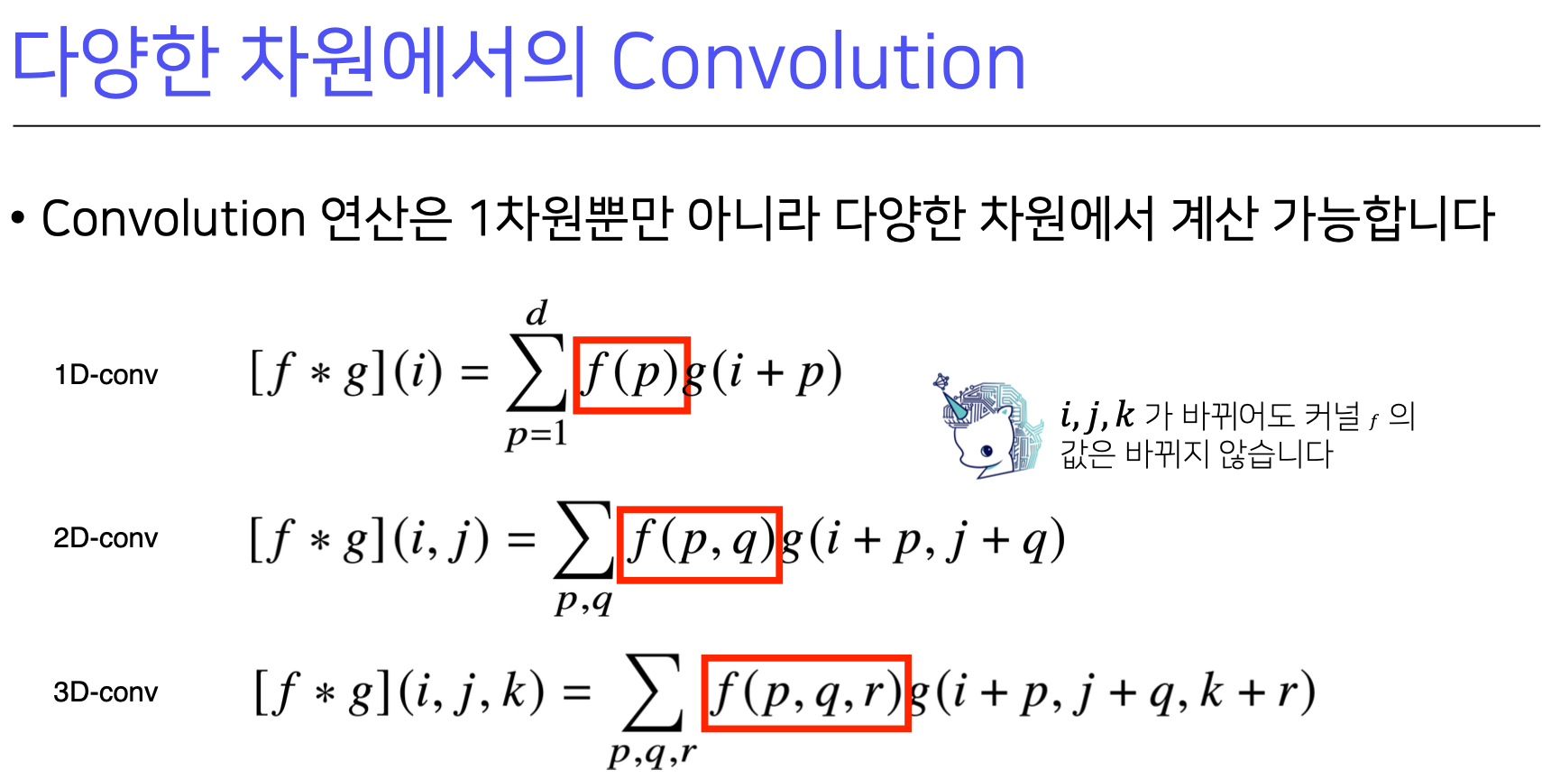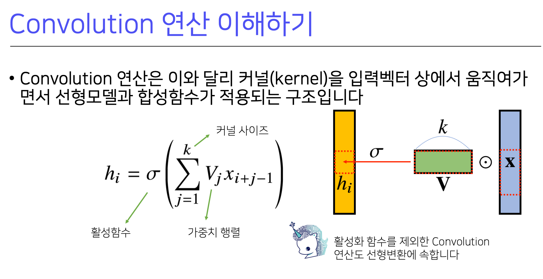 그러나 Convolution 연산은 커널이 입력 벡터상에서 움직여가면서 선형 모델과 합성되는 것이다.
