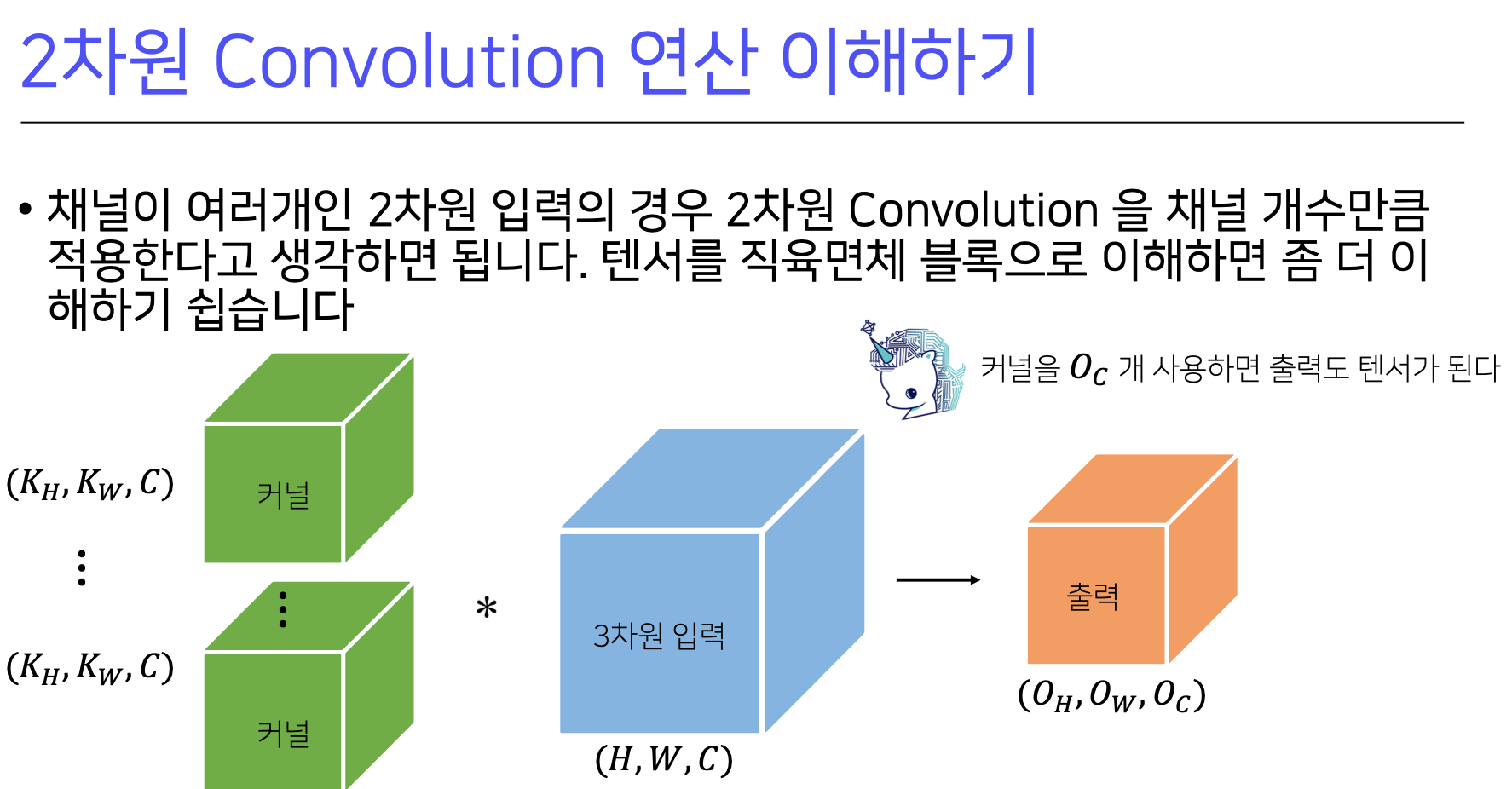 3차원 입력의 각 층에 커널의 개수를 c개만큼 곱해주면 출력 결과도 3차원으로(텐서라고 부른다) 출력된다.