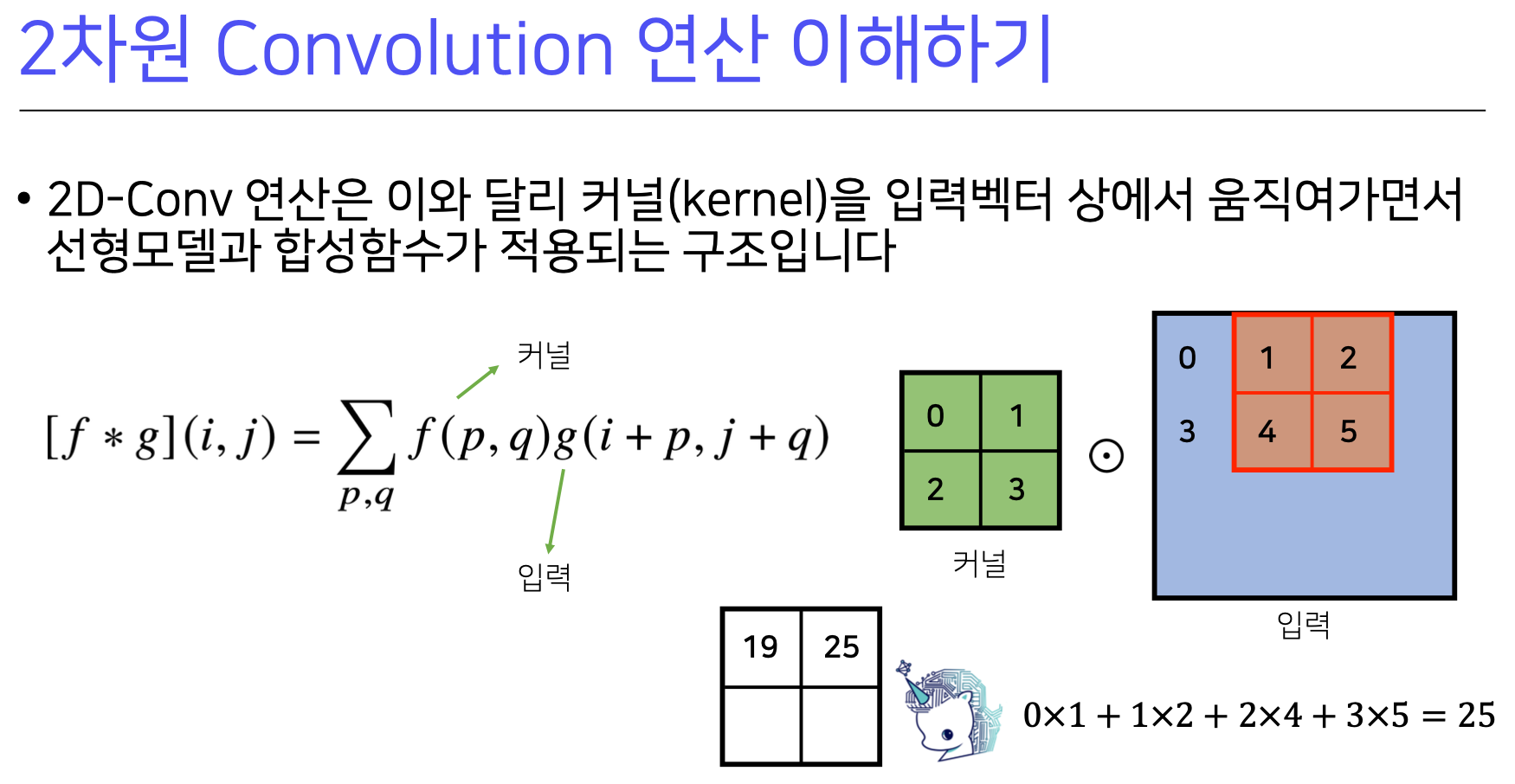 2차원 Convolution 연산에서 커 놀 울 입력 벡터 상에서 움직여 가면서 선형 모델과 합성함수가 적용된다.
