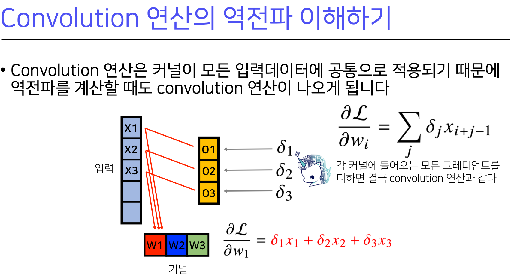 따라서 각 커널에 들어오는 모든 그레디언트를 더하면 convolution과 같아진다.