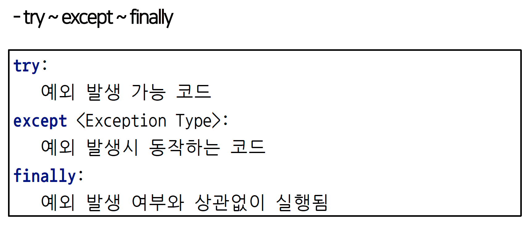 2. 예상이 불가능한 예외(인터프리터 과정에서 발생, 개발자 실수, 인덱스 에러, ZeroDivisionError 등)