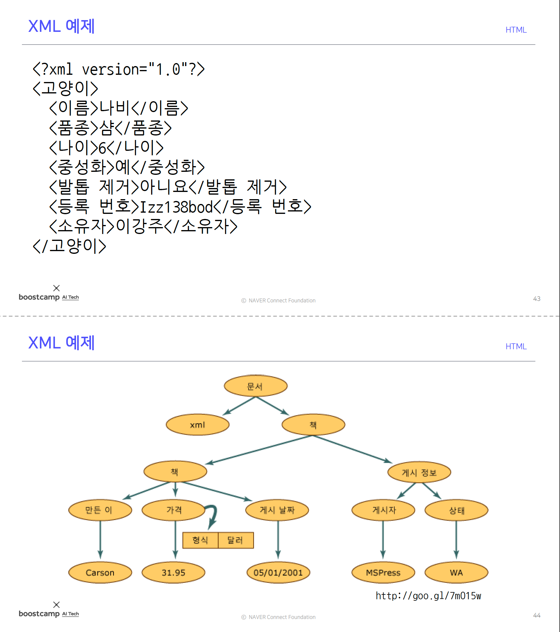 XML: 데이터의 구조와 의미를 설명하는 마크업 언어 이다. HTML과 문법이 비슷하다. 컴퓨터 간에 정보를 주고받기 용이하다.