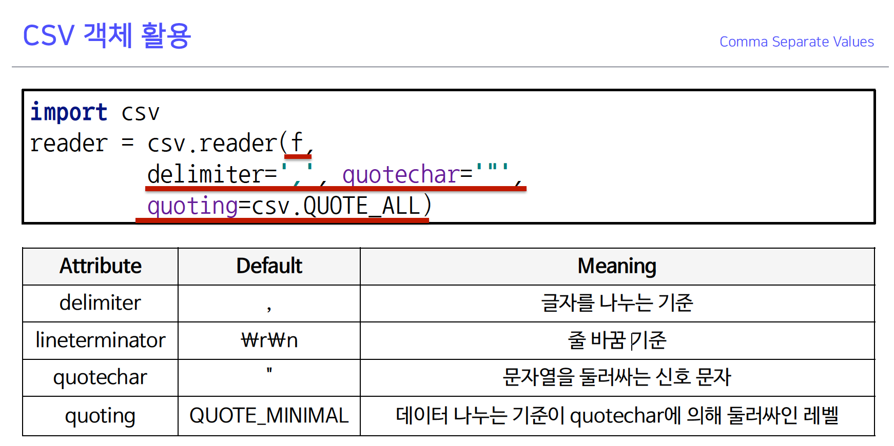 CSV : 필드를 쉼표(,)로 구분한 텍스트 파일, comma separate values, 엑셀 양식의 데이터를 프로그램에 적용시키기 위한 데이터 형식, import csv를 이용해서 csv객체로 간단히 처리 가능하다.