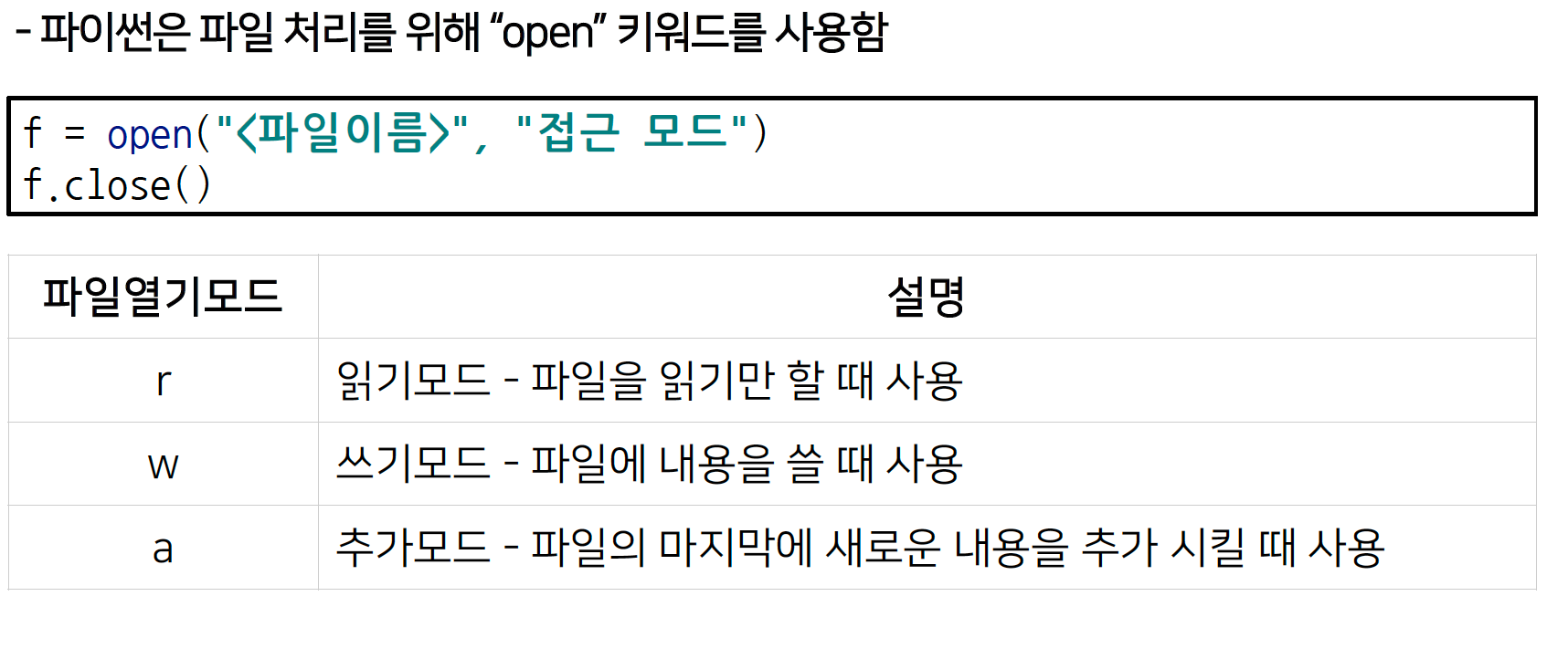 파이썬의 파일 처리를 위해선 open이라는 함수를 사용한다.