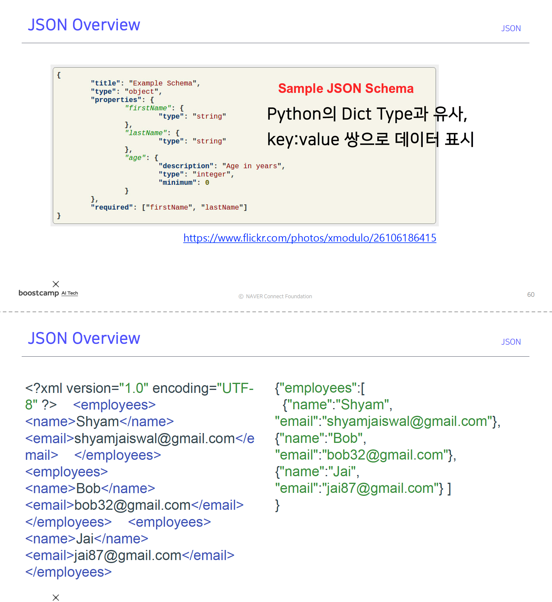 JSON: JavaScripy Object Notation이다. xml 대체제, 데이터의 용량이 적고 코드로 전환이 쉽다. 파이썬의 dict type과 상호호환이 가능하다. 파이썬에서 json 모듈을 제공하기에 import 해서 간단하게 사용이 가능하다.