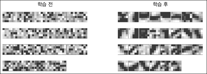 처음에는 convultion filter 역시 초기값 설정을 통해 무작위로 분포하게 되지만, 학습을 통해서 아래의 오른쪽과 같이 완성된 edge filter로 만들어지게 된다.