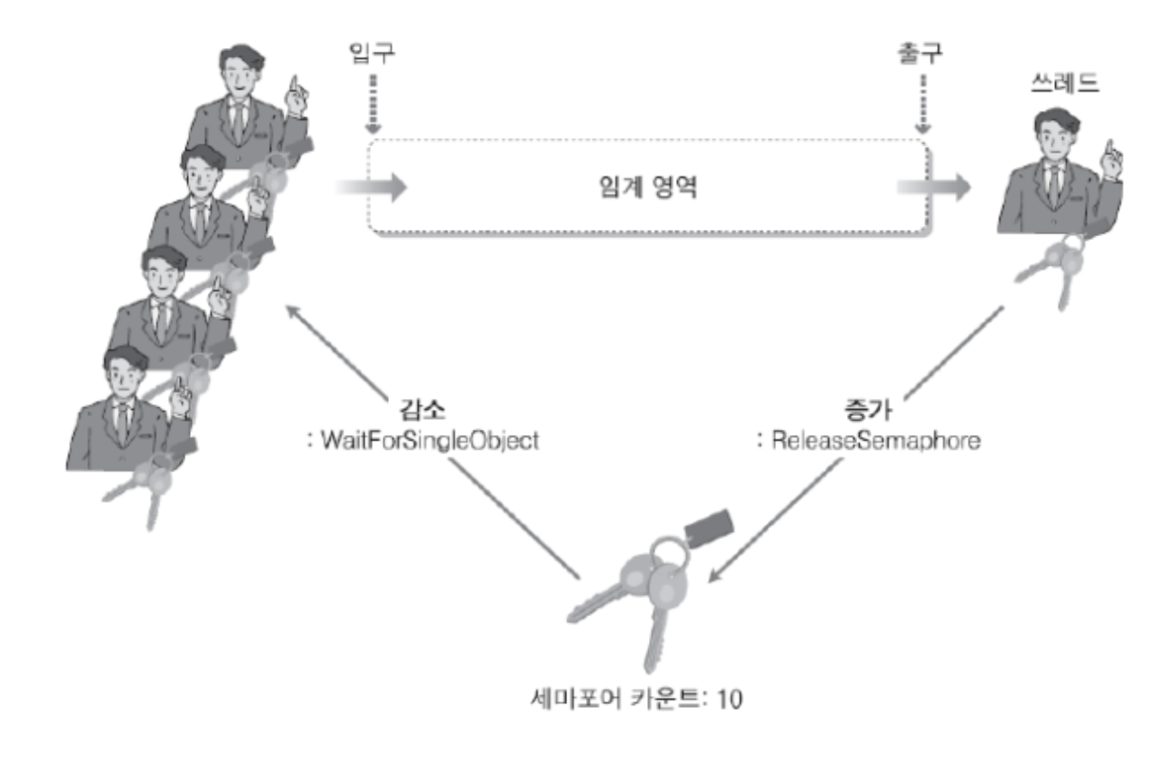 // 초기 카운트 10이면, WaitForSingleObject 함수를 호출하여 세마포어 핸들을 인자로 전달하면서