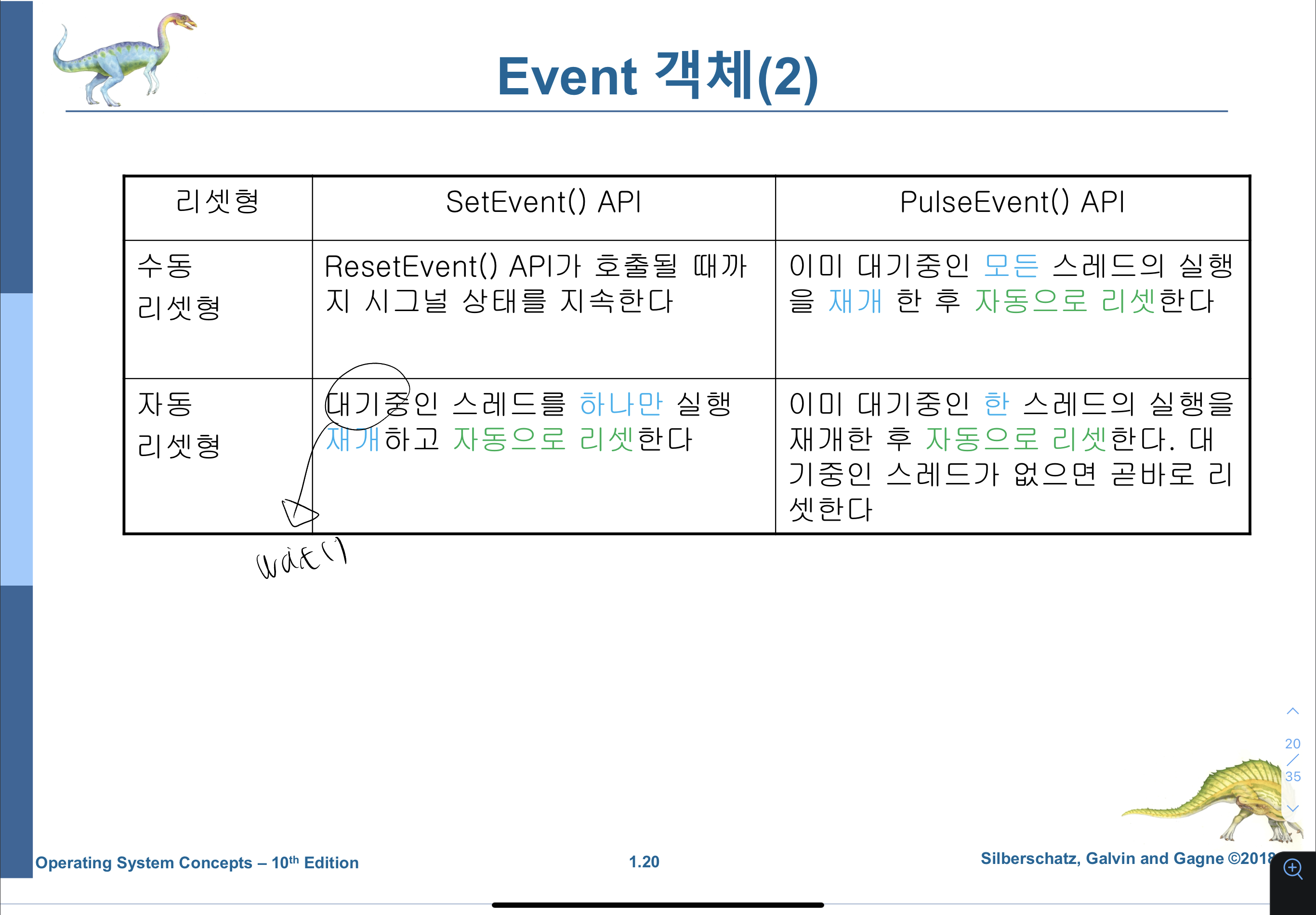 수동 Reset과 차이점은 setevent()가 실행될 때 wait 상태에 들어간 스레드를 한 개만 깨운다.(누가 깨울지는 OS가 안다.)
