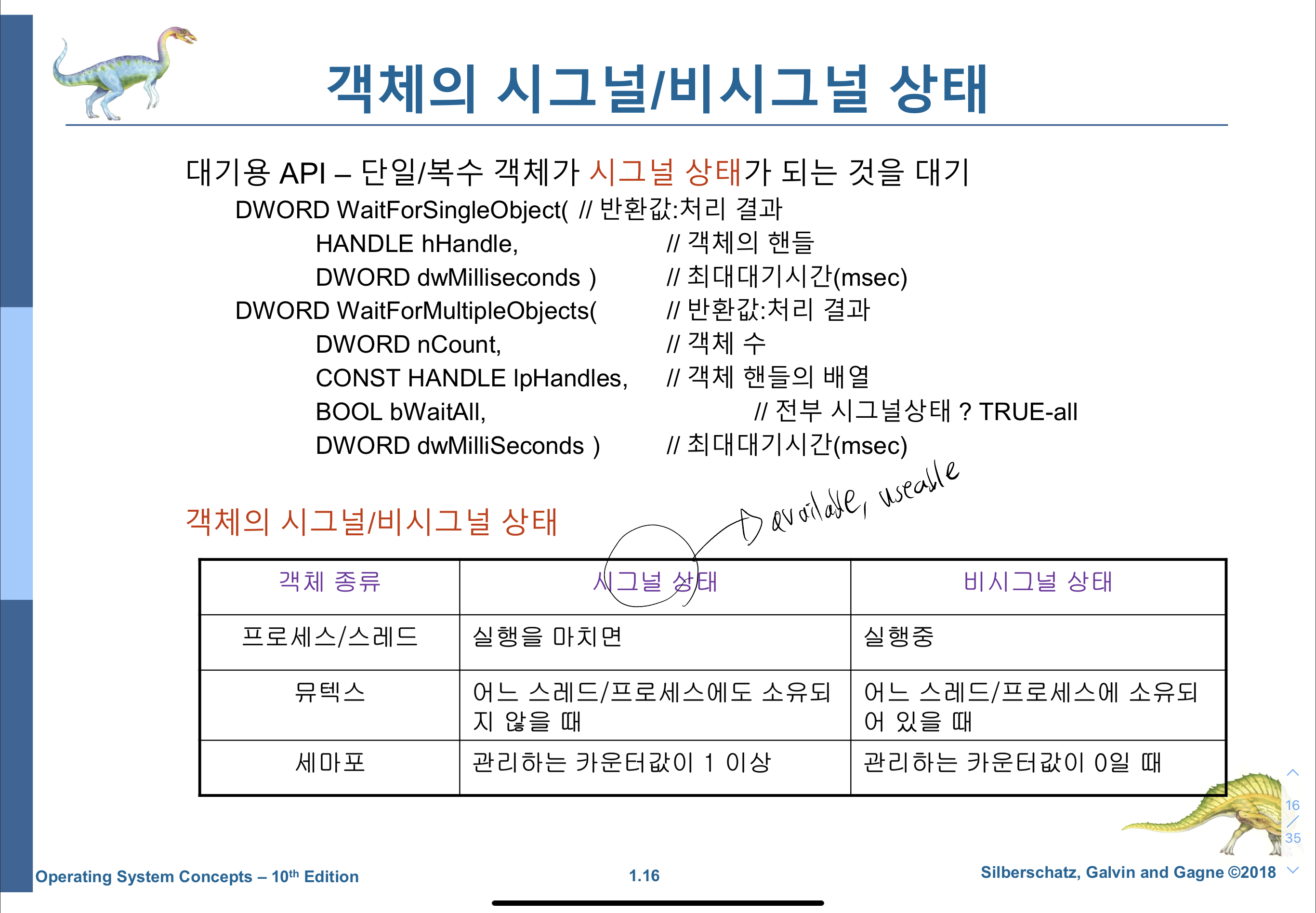 위의 자료에서 대기용 API가 존재하는데 이는 지정된 개체를 시그널 상태가 될 때까지 혹은 비 시그널 상태로 제한시간동안 기다리게 한다.