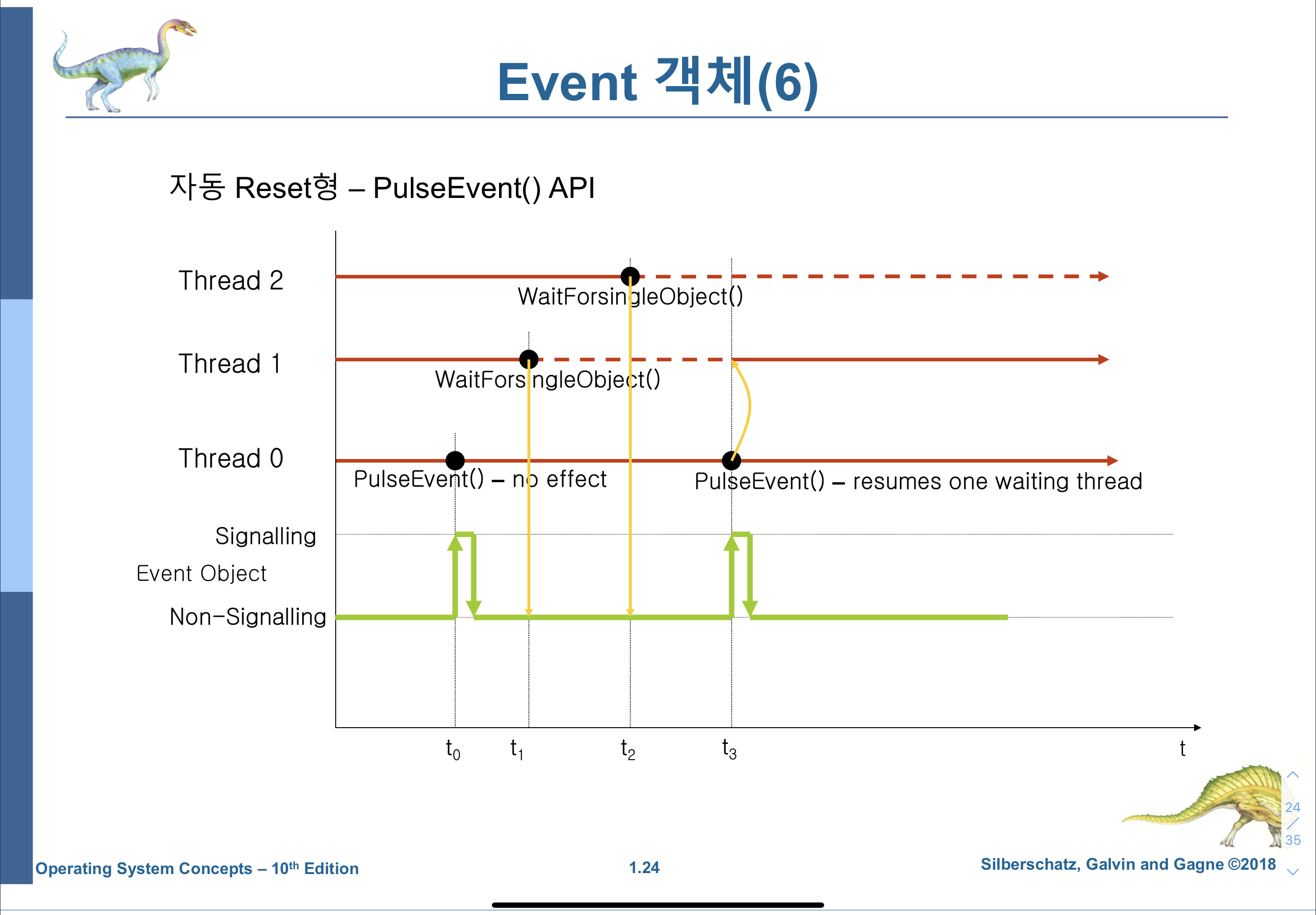 그러나 PulseEvent의 경우 thread 1,2 가 계속 waiting 상태에 있는 것이 아니라 pulseEvent()를 다시 만나면