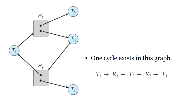 1개의 순환구조가 만들어졌고 모든 인스턴스 들이 스레드에 할당 되어 있지만 만약에 T2 or T4가 자원을 다 쓰고 반납한다면 T3나 T1은 자원을 할당받는 것이 가능하다. 따라서 Deadlock 상태가 발생하지 않는다.