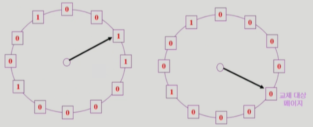 Reference bit가 0인 것을 찾을 때까지 시계처럼 한 바퀴씩 포인터를 이동하다가 0인 것을 찾으면 해당 page를 교체하는 방식이다.