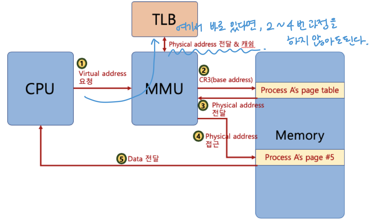 MMU가 물리 주소를 매번 확인하기 위해 메모리를 왔다 갔다 해야 하는 과정을 좀 더 효율적으로 하게 하기 위해서 사용되는 것이 TLB이다.