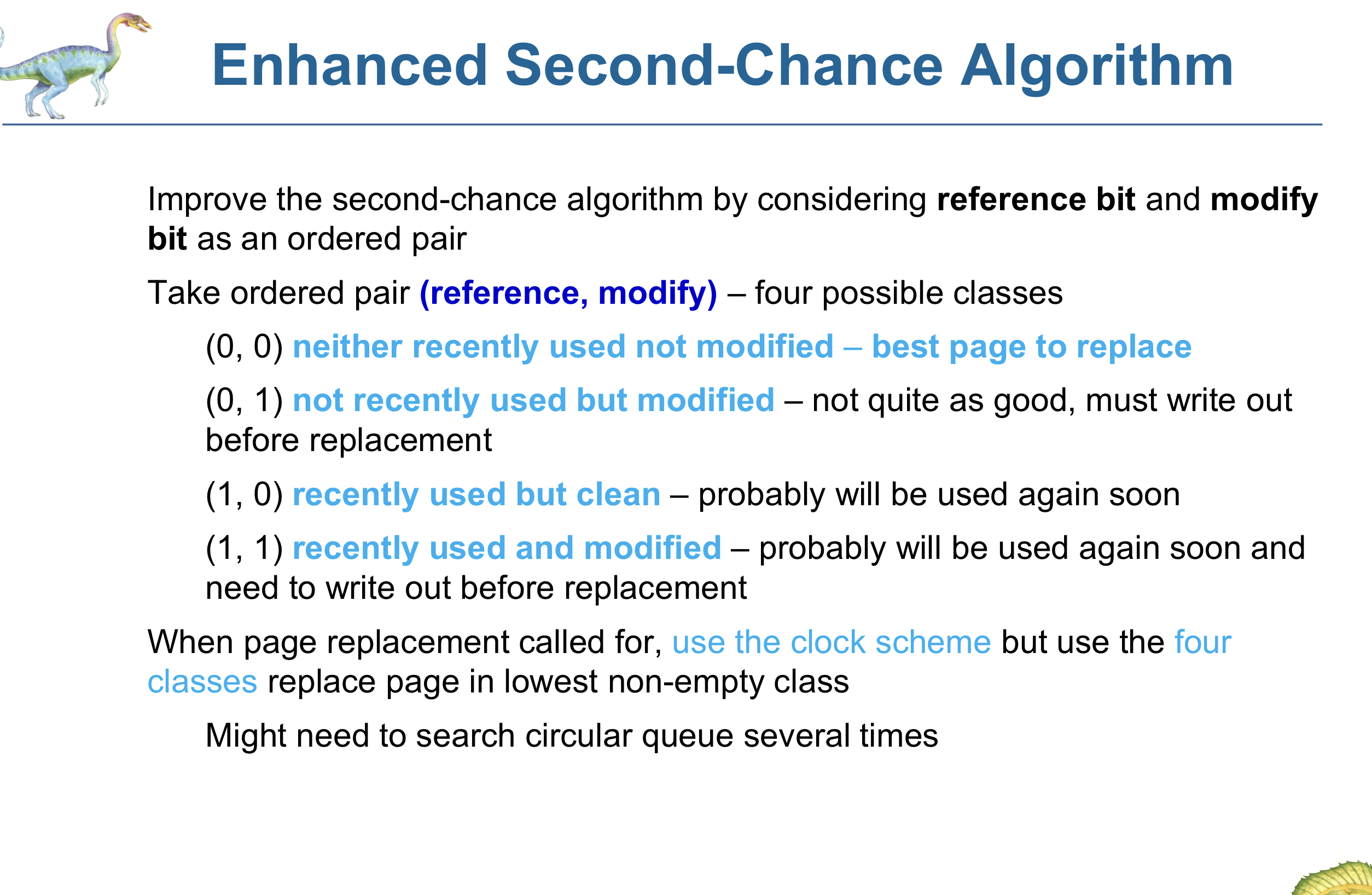 이를 조금 더 개선한 방식으로 Enhanced Second Chance Algorithm이 있는데, 최근에 해당 page가 변경이 되었는지를 나타내는 Modified bit(dirty bit)가 추가된 것이다.