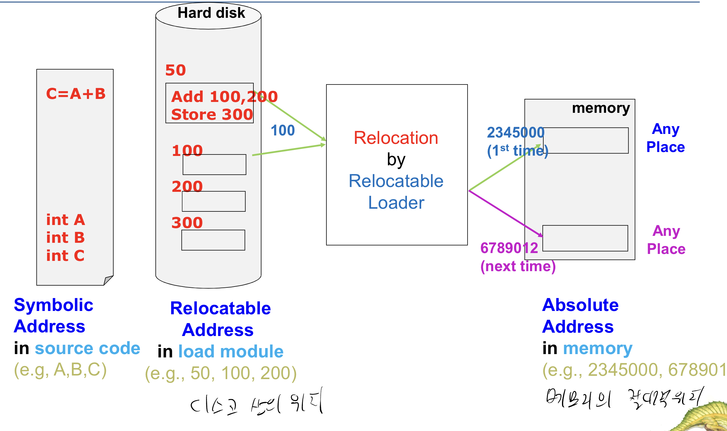 위의 예시를 보면 소스코드 상에서는 symbolic address로 존재한다 이는 하드디스크 상에서 Relocatable Address로 존재하고 이를 Relocation을 통해서 메모리의 물리적 위치의 주소 즉, Absolute Address가 된다.