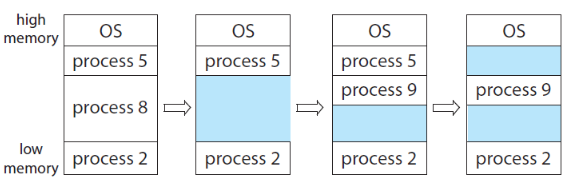 - 내부 단편화 (internal fragmentation): 빈 공간에 메모리를 할당하고 난 뒤 공간이 남아 다른 메모리를 할당할 수 없는 상태