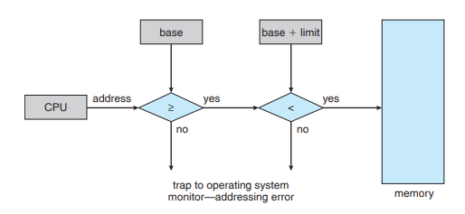 Base, Limit 레지스터들은 운영체제의 전용 연산에 의해서만 load 된다. 즉 커널 모드에서만 작동하고 이는 운영체제만이 이 레지스터들의 값을 변경할 수 있다는 것을 의미한다.