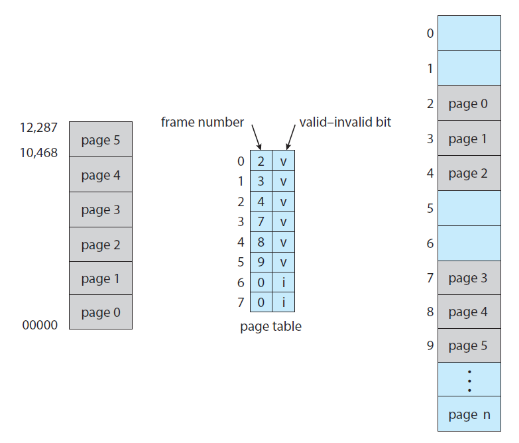 페이징 이용 시 보호 비트를 통해서 메모리를 보호해야 한다. 하드웨어적으로 유효-무효 비트를 각 프레임에 추가해 메모리 접근이 유효한지 아닌지 확인 가능하다. valid일 경우 이에 해당하는 페이지가 프로세스의 논리 주소 공간에 포함되어 있고 invalid일 경우 논리 주소 공간에 없으므로 잘못된 접근이다. 잘못된 접근의 경우 인터럽터를 걸어버린다.
