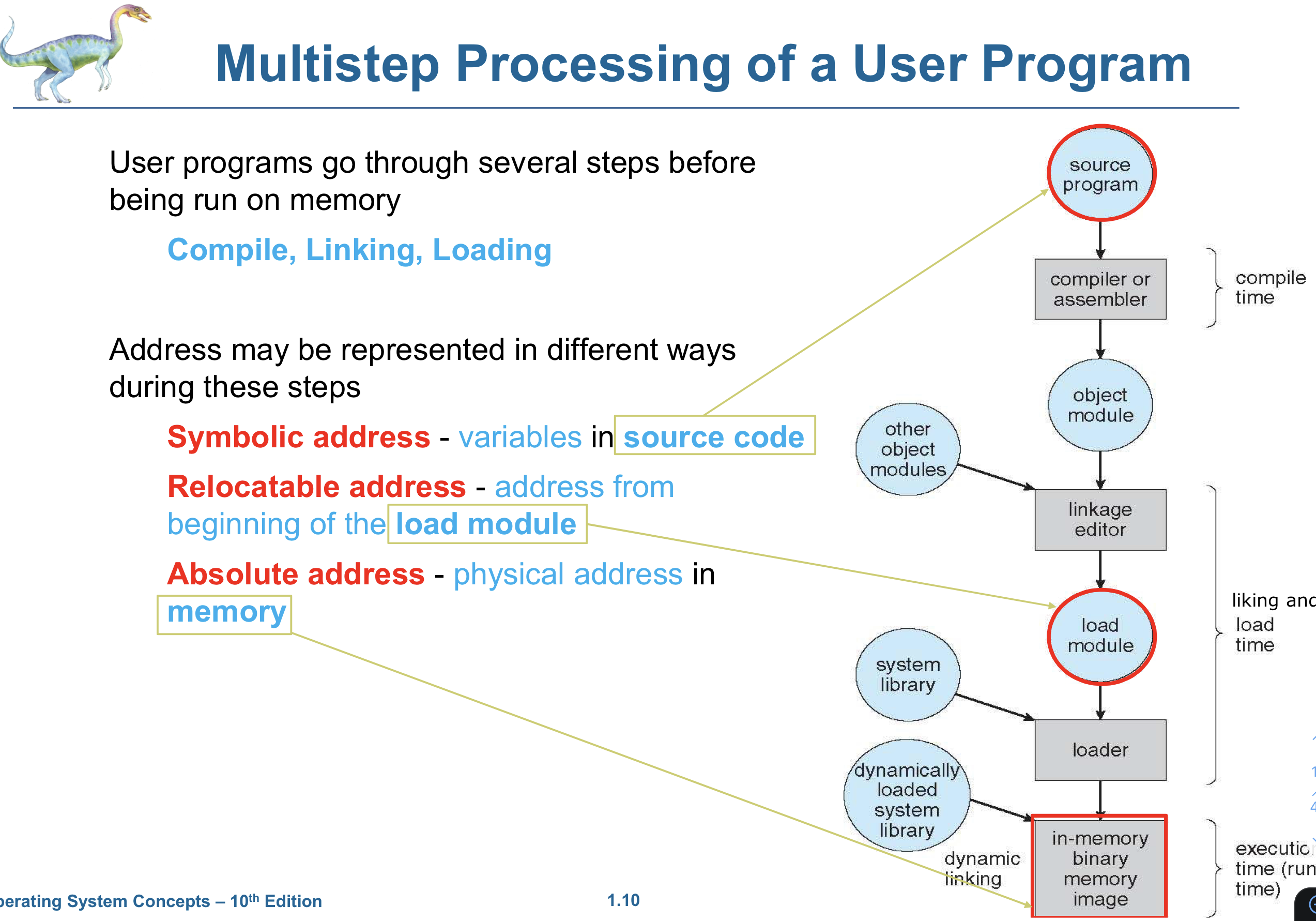 위의 예시를 보면 소스코드 상에서는 symbolic address로 존재한다 이는 하드디스크 상에서 Relocatable Address로 존재하고 이를 Relocation을 통해서 메모리의 물리적 위치의 주소 즉, Absolute Address가 된다.